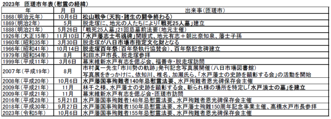 匝瑳市での慰霊の経緯を年表にまとめました。匝瑳市の皆様は、松山戦争(諸生・天狗最後の戦い)直後から、戦没者を手厚く供養して来てくださいました。感謝しかありません。
